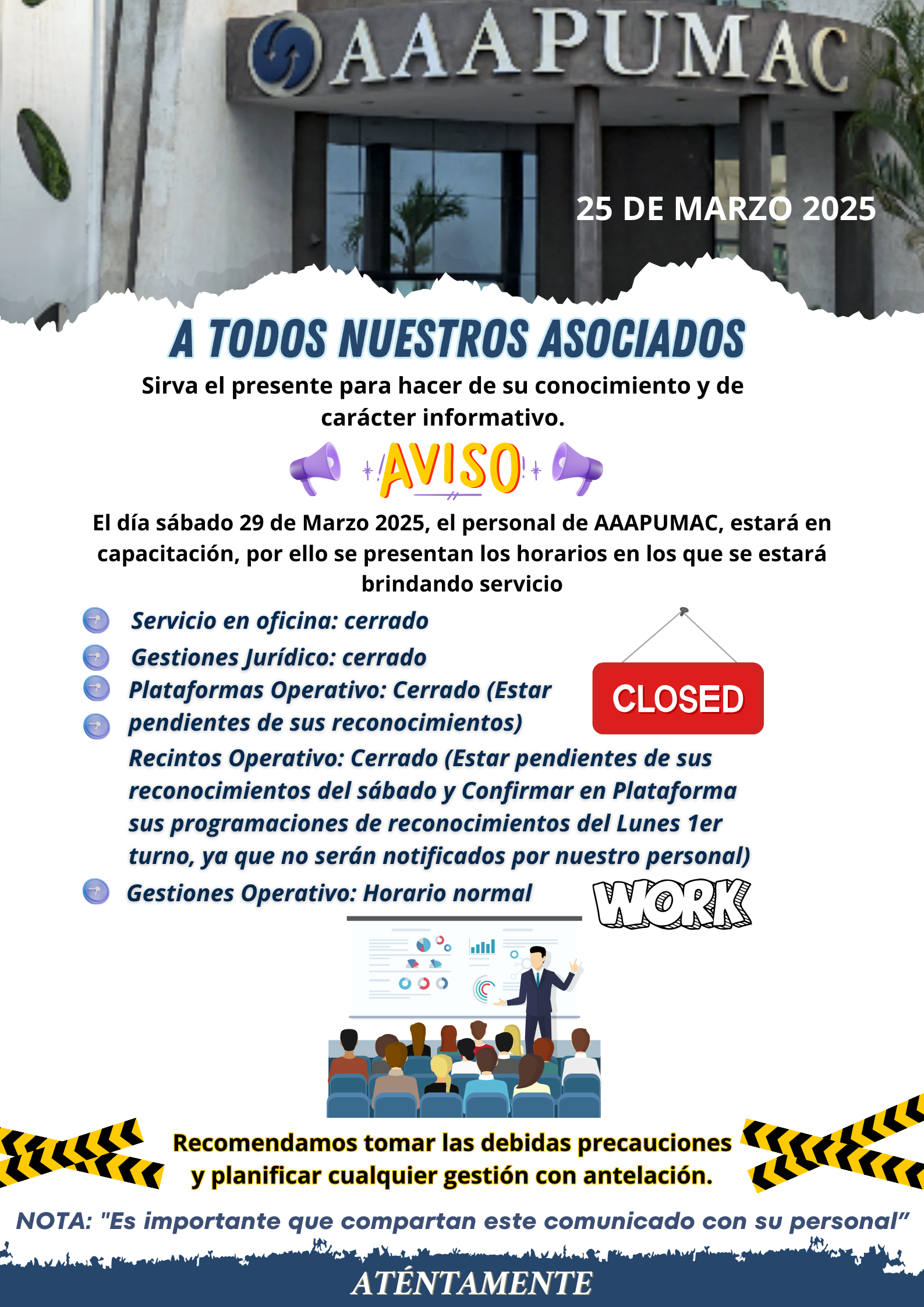 AAAPUMAC INFORMA // HORARIOS DE OFICINA AAAPUMAC// SÁBADO 29 DE MARZO//