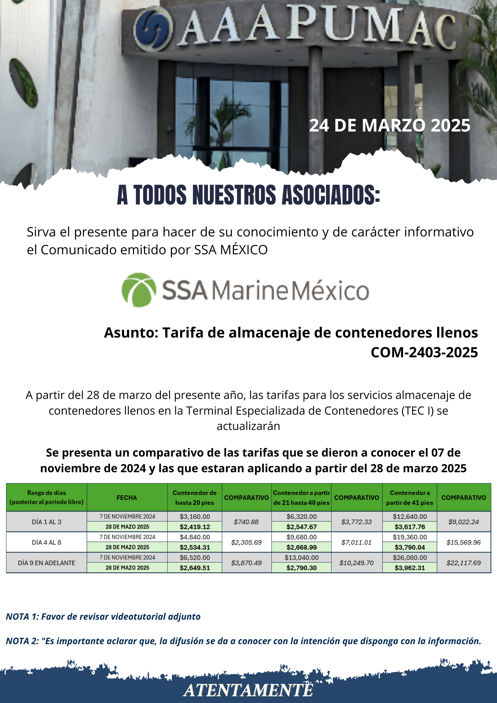 AAAPUMAC INFORMA // COM-2403-2025 Tarifa de almacenaje de contenedores llenos.// SSA MÉXICO